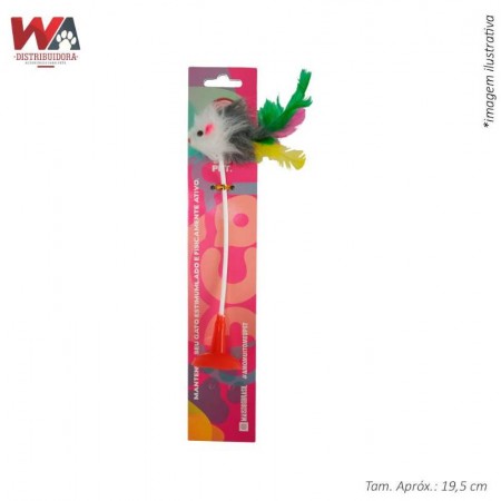 O "BRINQ GATO VARINHA COM/RATINHO" é um brinquedo interativo para gatos, com uma haste (varinha) e um ratinho de pelúcia na ponta, que estimula o instinto de caça, combate o tédio e promove exercício, usando materiais seguros como pena, vinil e