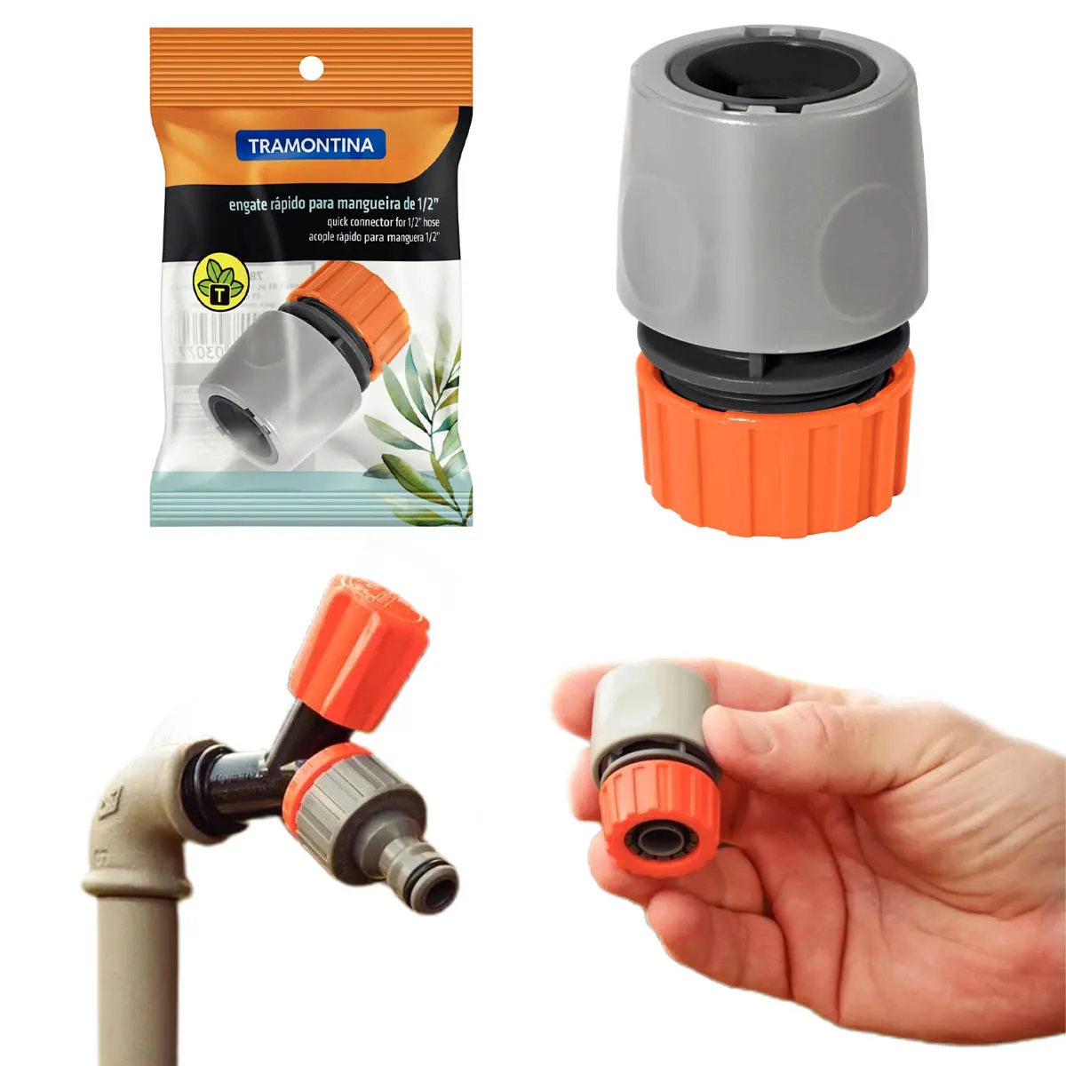 Engate Rápido Tramontina em Plástico para Mangueiras de 1/2". Este produto é um acessório de jardinagem projetado para conectar mangueiras a torneiras ou outros acessórios (como esguichos) de forma prática, através de um sistema de "click"
