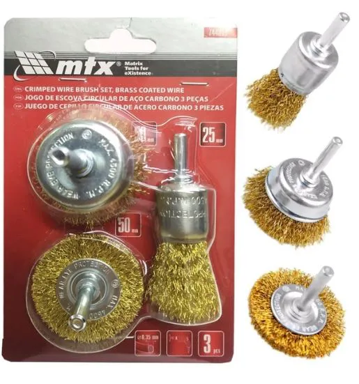 O jogo de escovas de aço para furadeira com 3 peças da marca MTX, modelo 744869, é um kit de acessórios usado para limpeza de superfícies, remoção de ferrugem, sujeira e tintas. O conjunto inclui três escovas com diferentes formatos (circular, copo e pinc