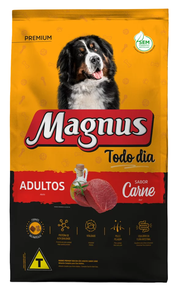 Ração Seca Magnus Premium Todo Dia Sabor Carne é um alimento completo para cães adultos de todas as raças, acima de 12 meses. O saco de 15 kg é a embalagem de maior porte disponível para o produto. É uma ração classificada como premium, sendo uma opção co