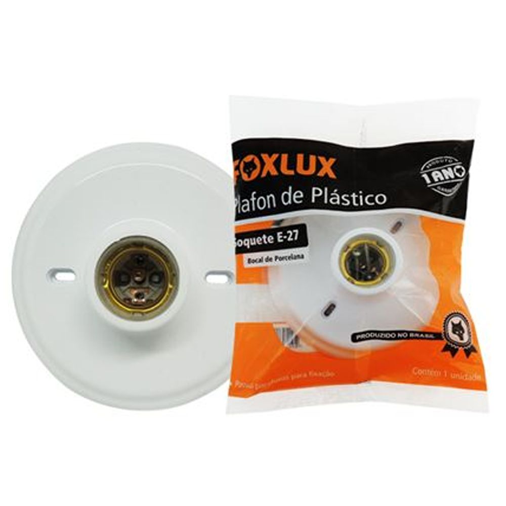O Plafon de Plástico Foxlux pode ser utilizado com lâmpadas LED, eletrônicas e lâmpada halógena clássica. Possui bocal de porcelana Foxlux e acompanha parafusos para fixação. Sistema de encaixe sem parafusos aparentes.Bocal de Porcelana FoxluxSoquet