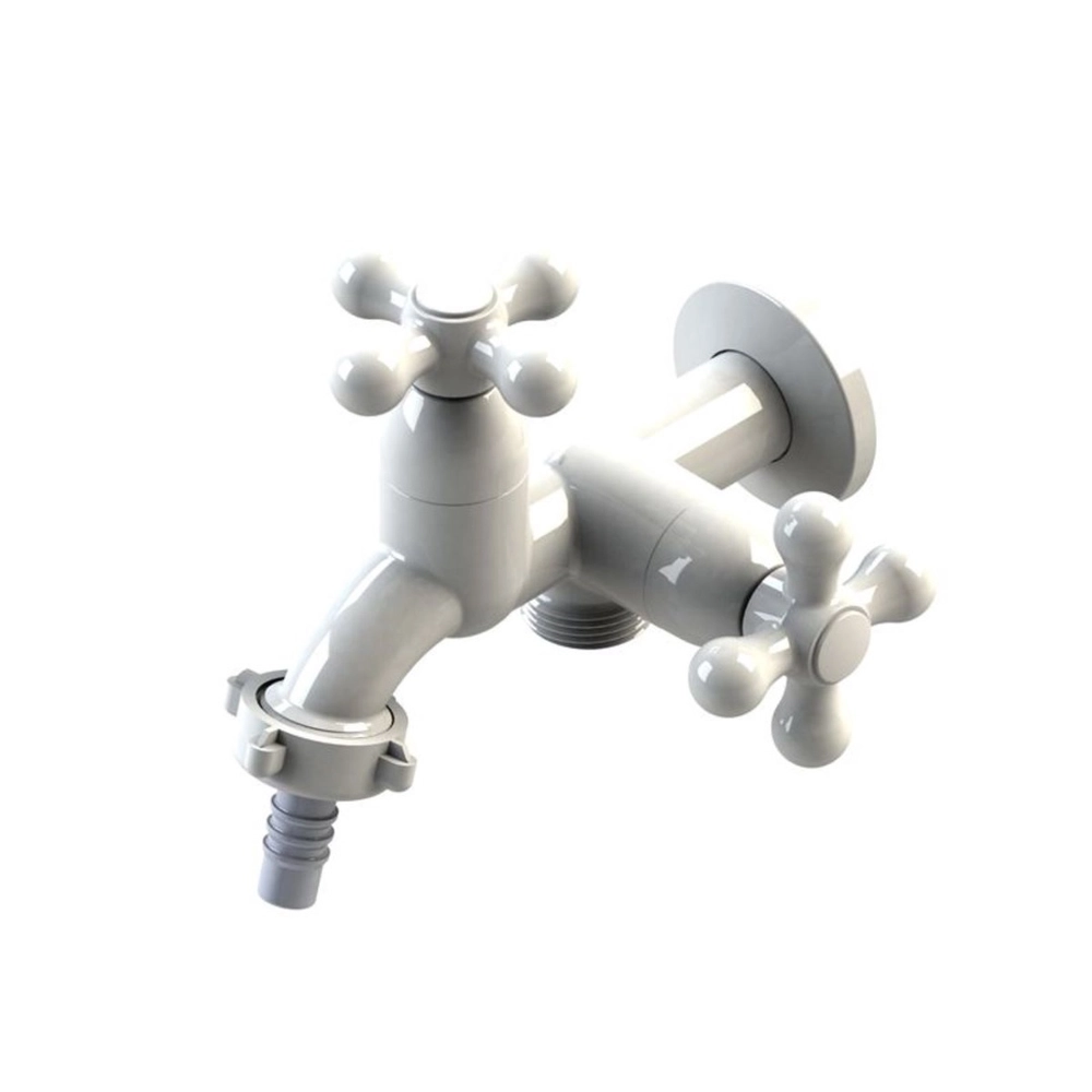 torneira dupla para tanque e máquina de lavar, que possui saídas com bitolas diferentes, normalmente uma de 1/2 polegada (padrão para tanques) e outra de 3/4 polegadas (padrão para máquinas de lavar).